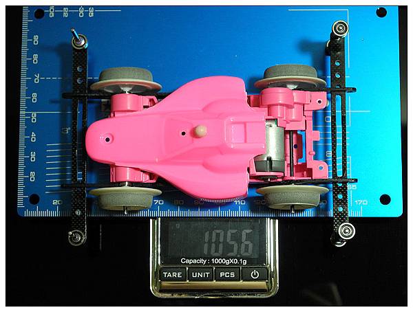 我的粉紅井字車來了!!!!這個重量是加了馬達&電池~為什麼是105.6…多出來的5.6克,讓人看的很不爽...